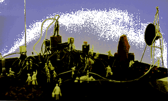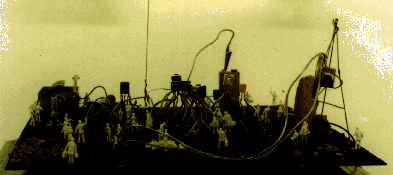 A radio, a miniature city made out of radio components. Placed in the ground you can see it through a glass. From a tiny speaker you can hear the voices.